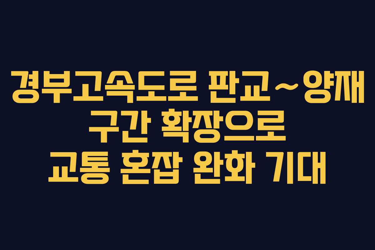 2023년 7월 30일 24:00를 기해 경부고속도로 판교∼양재 구간이 조기 개통되었습니다. 이 구간은 7.5㎞에 달하며, 기존의 8차선에서 10차선으로 확장되었습니다. 이로 인해 교통량이 증가하는 하계 휴가철의 원활한 소통을 도모할 수 있게 되었습니다. 교통 혼잡 지역은 이전까지 빨간 불이 켜져 있었으나, 이번 확장으로 인해 교통 흐름이 개선될 것으로 기대됩니다.
