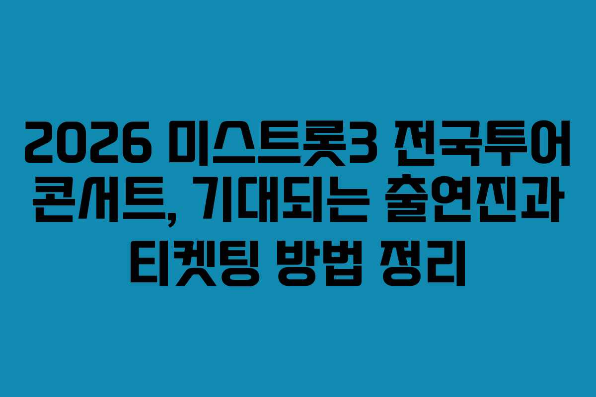2026 미스트롯3 전국투어 콘서트가 서울, 부산, 대전 등 여러 도시에서 개최됩니다. 이번 투어는 팬들에게 많은 기대를 모으고 있으며, 각 도시에서의 출연진과 티켓팅 정보를 미리 알아보는 것이 중요합니다. 공연을 즐기기 위한 준비를 도와주는 유용한 정보를 아래에서 확인해보세요.