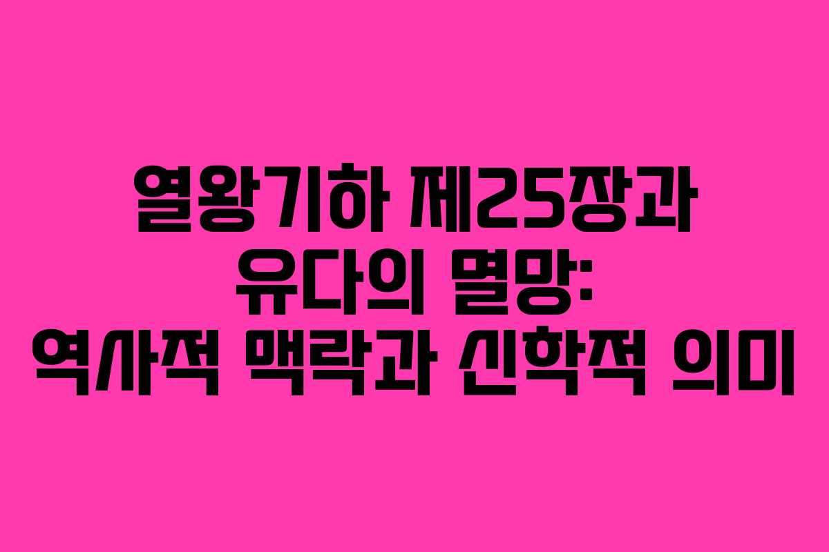 열왕기하 제25장은 유다 왕국의 멸망과 예루살렘의 함락에 관한 중대한 사건들을 다루고 있다. 이 장은 바벨론의 침공과 그로 인한 파괴를 통해 이스라엘 백성이 하나님의 말씀을 어기고 우상을 숭배한 결과를 보여준다. 본문에서는 예루살렘이 포위당한 시점과 이에 대한 신학적 해석을 통해 당시 상황을 깊이 이해할 수 있다.