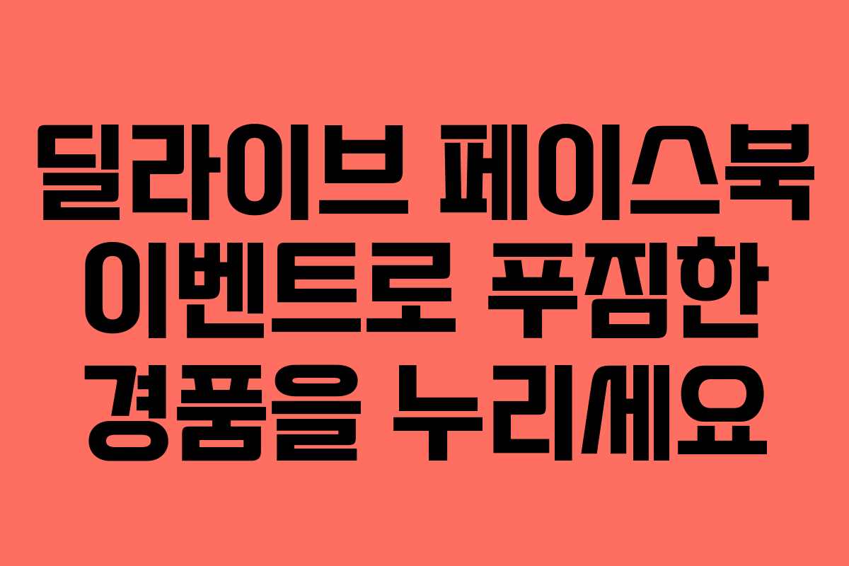 이번 딜라이브 페이스북 이벤트는 매우 간단한 참여 방법으로 푸짐한 경품을 받을 수 있는 기회를 제공합니다. 여러분의 많은 참여를 통해 더욱 풍성한 혜택을 누리시길 바랍니다. 이벤트에 참여하시고, 즐거운 경험을 만끽하세요.